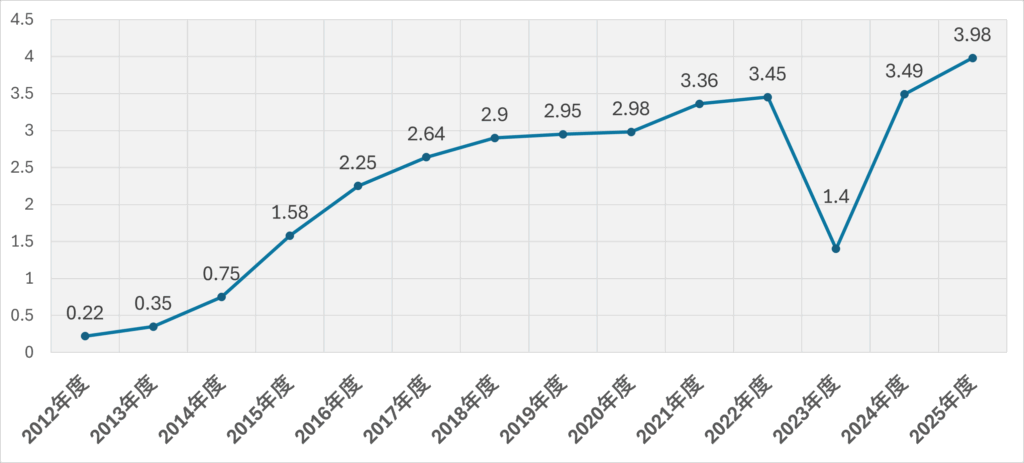 これは、2024年度の3.49円から0.49円の増加で、過去最高の水準となります。