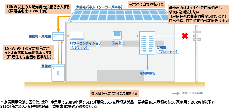 業務用施設・産業用施設・集合住宅・戸建住宅への自家消費型の太陽光発電設備及び蓄電池(車載型蓄電池を含む)の導入事業を対象としています。