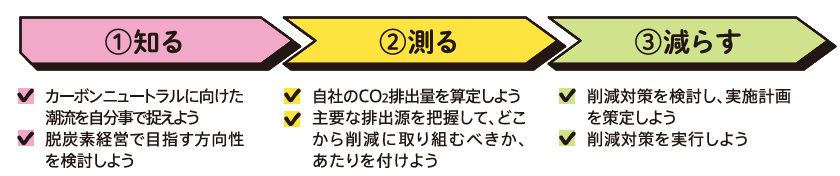 脱炭素経営の取組は、大きく「知る」「測る」「減らす」の3つのステップにわけられます。