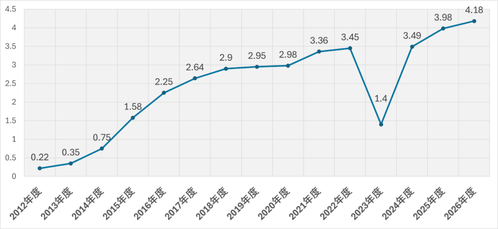 2025年度の3.98円から0.2円の増加し過去最高となり、2012年度以降毎年引き上げられています。(2023年度を除く)